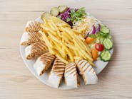 Pita Falafelw cienkim cieście, krążki z ciecierzycy, surówka z białej kapusty, pekinką, pomidor, ogórek zielony, sos do wyboru