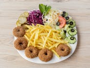 Tortilla Falafelkrążki z ciecierzycy, surówka z białej kapusty, pekinka, lodowa, pomidor, ogórek zielony, sos do wyboru